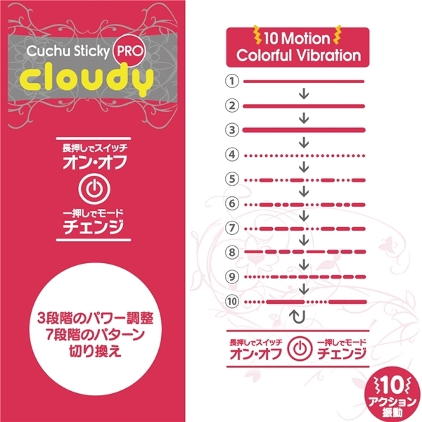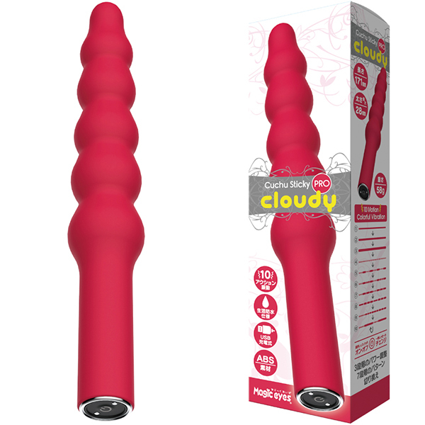 10モードもの振動パターンがあるので、その中から自分の好みを選ぶことが出来、生活防水設計となっているのでメンテナンス製にも優れています♪マグネット式の充電用USBケーブルが付属しているのでご家庭の環境で充電可能!操作方法も簡単で電源スイッチの長押しでオン・オフのみというシンプルさ♪クリムゾンマットコーティングのボディは長さ171mmと十分なサイズ、太さは最大28mmで細い部分から徐々に太くなるのでどなたにでも使用して頂けます。 ![]() --![]() Cloudy![]() パッケージ:19.8×5.5×3.9cm 本体:全長17.1cm・最大径2.8cm USB充電式![]() [ BACK ]