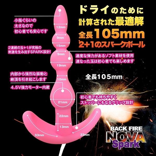 ![]() 人気のバックファイアシリーズから「バックファイアーNOVA SPARK」が登場♪スパークは座薬の位の大きさの1センチの先端から始まっていき、2連続の15mm&19mmの玉が続き最後は内部にローターを搭載した21mmの玉が待ち構えるという仕様!全部で4箇所の隆起を体験する設計で、1個の玉を通過するたびに、ゾクゾク感と振動が強くなっていき、最後の玉を飲み込んだ時には、まさに脳内でスパーク現象が引き起こされることでしょう!カラーバリエーションはブラックとブルー、ピンクの3色展開でピンクとなります。