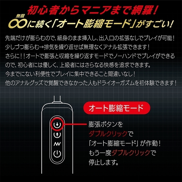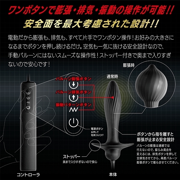 ![]() ワンボタンで膨らむ電動アナルバルーンが、前立腺をワイドに圧迫刺激!お好みサイズに膨らませて、眠れる前立腺を一気に覚醒!初心者にも最適細身の本体を挿入後、先端だけを膨らませるので出入口の拡張なしでボリューム感たっぷりの圧迫を楽しめます。