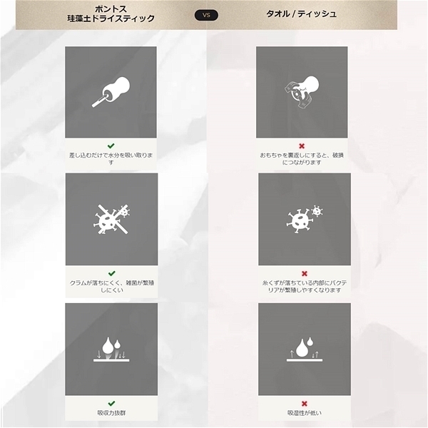 ポントス珪藻土ドライスティックは、おもちゃの水分を奥まで吸収し、おもちゃを何度もひっくり返すことによる損傷を防ぎます。 使うことでおもちゃを衛生的で耐久性のある状態に保つことができます。 ![]() --![]() ドライスティック![]() パッケージ:25.0×3.3cm 本体:全長19.0cm・直径1.5cm![]() [ BACK ]