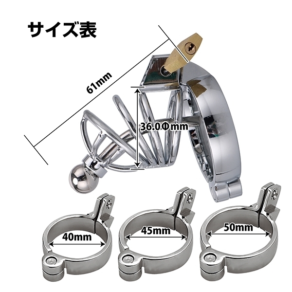 金属製の本格的な貞操帯の固定リングが3種類に増えて再登場!ペニスゲージで射精を管理!着脱可能な尿管の付いた刺激的なデザイン。 ![]() --![]() 楔刺(くさびざし)![]() パッケージ:28.0×18.5cm 本体:ペニスゲージ6.1×3.6cm・固定リング小(内径4.0cm)・固定リング中(内径4.5cm)・固定リング大(内径5.0cm) セット内容:ペニスゲージ、固定リング3サイズセット、尿管、南京錠、収納袋 ![]() [ BACK ]