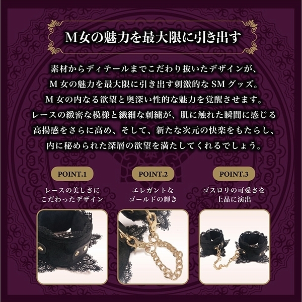 非日常を体験するのにチープ物では気持ちも盛り上がりません。 高級感あるベロア生地とレースで飾りつけた心の奥のM願望を刺激してください。 ![]() --![]() 足枷![]() パッケージ:18.0×9.9×7.0cm 本体:35.0×11.5×1.0cm×2個・チェーン長21cm![]() [ BACK ]