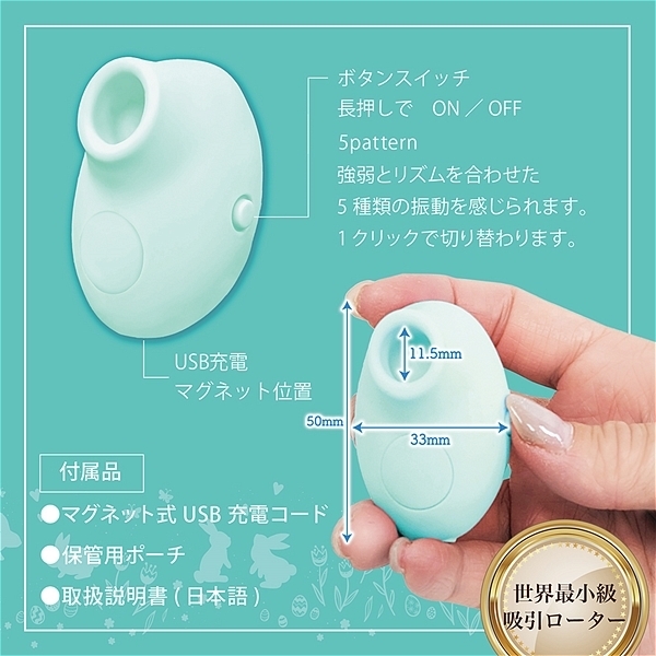 アンケートで女性に好評だったパステルカラー3色が揃ってデビュー!「エアーバルブ方式」を採用し、近年発売されるトイの中でも注目度の高い吸引系グッズを、世界最小レベルの超小型化に成功。 握ると手の中に隠れてしまうほどの極小サイズです。 段階を経て優しく吸引することにより、心地の良いオーガズムを体感することができます。 ●カラー:グリーン ![]() グリーン![]() --