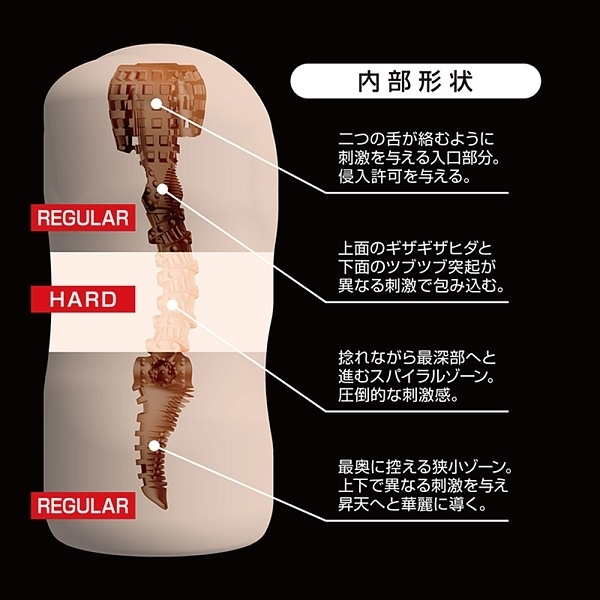 絹の様な柔らかい感触と、しっかりと刺激を与えるハードな感触が交互に訪れます。 また内部構造は二つの舌が絡みつく入り口部分。 上下で異なる感触面を通過し、捻れるヒダを通過する中間部。 狭小の壁面でしっかりと包み込む最奥部。 これらは快感を高めるために考えられた構造になっています。 ![]() --![]() --