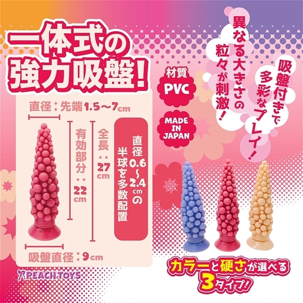 異なる大きさの粒々が刺激!全長27cmの巨大ディルド。 先端は小さく、段々と広がる円錐形状に大きさの異なる粒々がランダムに配置!直径0.6〜2.4cmの半球を多数配置●カラーと硬さが選べる3タイプ!柔らかな素材感!<スタンダードピンク>ピンクのスタンダードタイプ。 適度な弾力と柔軟な素材感! ![]() スタンダードピンク![]() --
