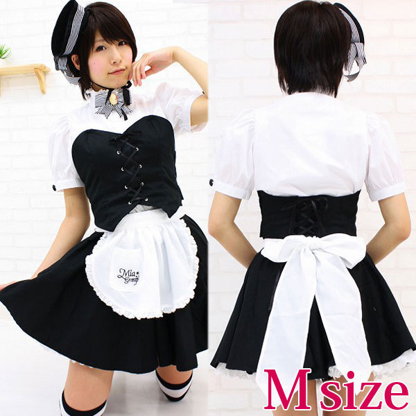![]() 人気メイドカフェの制服が登場!ビスチェとふんわりミニ丈スカートのオシャレなメイド服!帽子や、ブローチ、カチューシャと小物も充実して、完璧なミアカフェメイドさんになれちゃうコスプレ衣装です。