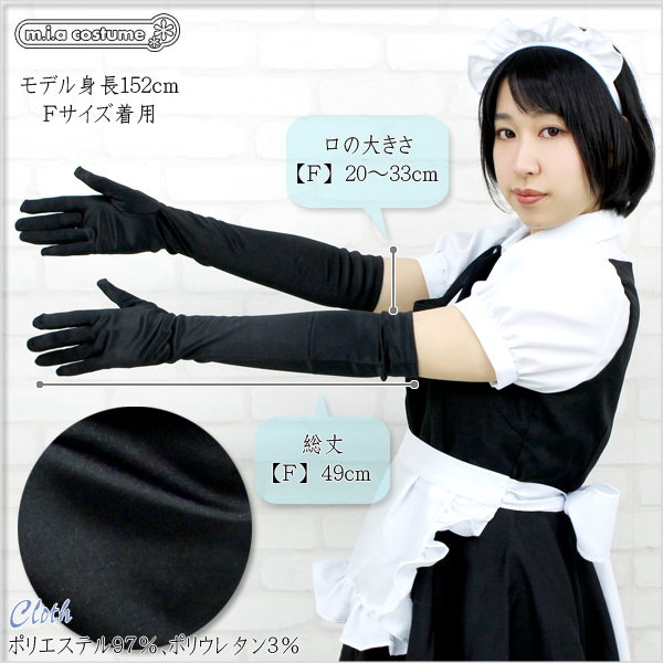 サテン生地なので高級感もUP!きちんと手にフィットし、着け心地もとってもいい感じです!長さは肘上くらいになります。 手袋は意外と重宝するもの!他のコスプレとも相性は抜群です。 ※水洗い可、塩素系漂白剤による漂白不可、ドライクリーニング可。 ※こちらの商品は在庫の状況によりお届けまでに4日〜7日程度かかる場合がございます。 ![]() 黒![]() DE6010F![]() フリーサイズ:総丈49cm・口の大きさ20〜33cm 素材:ポリエステル97%、ポリウレタン3%![]() [ BACK ]