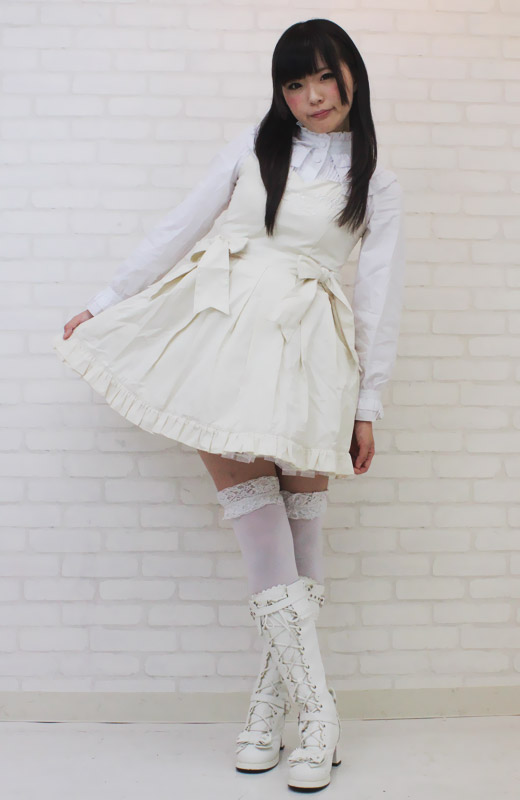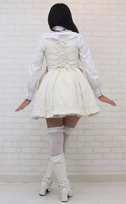 パニエが一体型になっているので、簡単に着こなせます。 ウエスト両サイドのリボンが印象的!背面の編み上げはバックスタイルをキュートに見せます。 胸元の刺繍モチーフも美しく、細部に至るまでデザインにこだわりを見せるロリィタ衣装です。 ※水洗い不可、塩素系漂白剤による漂白不可、アイロンは中温で当て布使用、ドライクリーニング可、色落ちの可能性があります。 ※こちらの商品は在庫の状況によりお届けまでに4日〜7日程度かかる場合がございます。 ![]() オフホワイト![]() NK1007M![]() Mサイズ:B78〜86cm・W62〜74cm 丈:ジャンパースカート76cm・ブラウス49cm(肩幅36cm、袖丈61cm、袖口20cm) セット内容:ジャンパースカート(横ファスナー、後ろ編み上げシャーリング、パニエ内蔵)・ブラウス(前ボタン、後ろ編み上げシャーリング) ![]() [ BACK ]