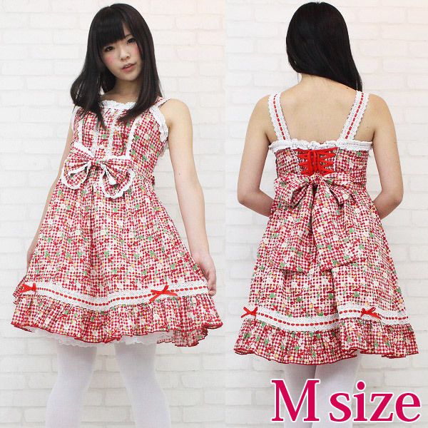 ![]() 真っ赤なチェリー&ベリーでキュートに仕上げた、ギンガムチェックのジャンパースカート(M)。