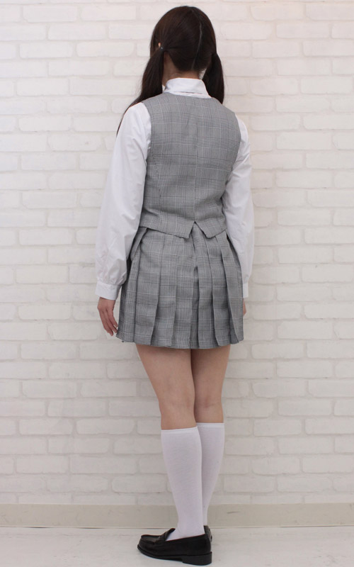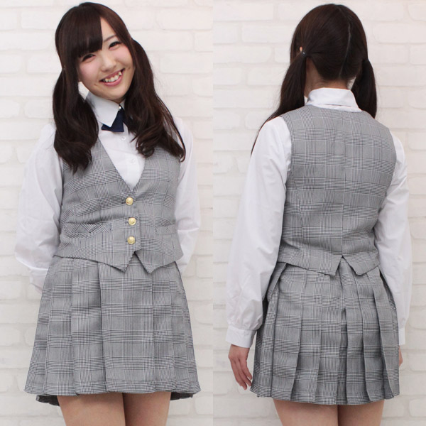 ![]() 金ボタン付きのベストがポイントになった中間服タイプ!グレーチェックで清楚なお嬢様風に仕上げた制服コスプレ(BIG)。