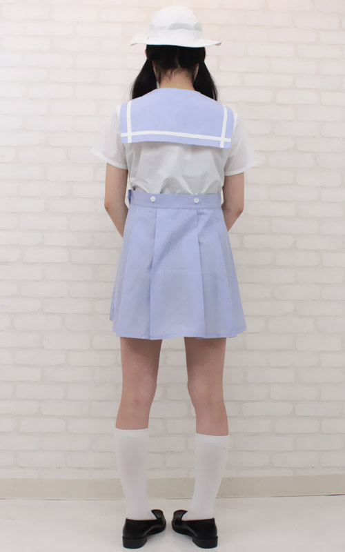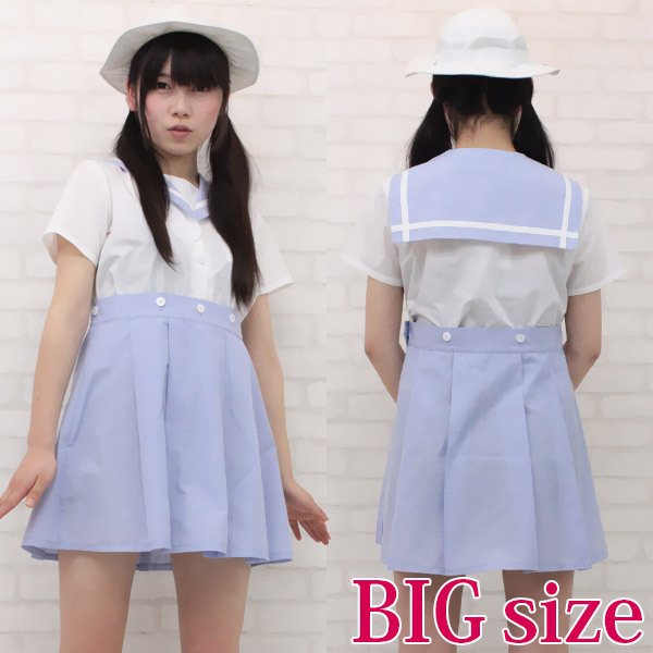 ![]() 昔懐かしいゴム付き帽子もセット!淡いブルーが爽やかな夏服タイプの制服コスプレ(BIG)。