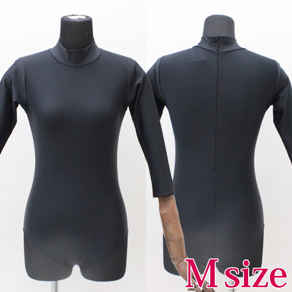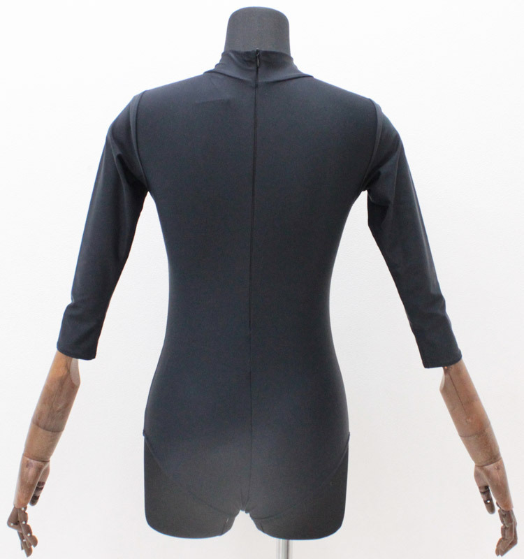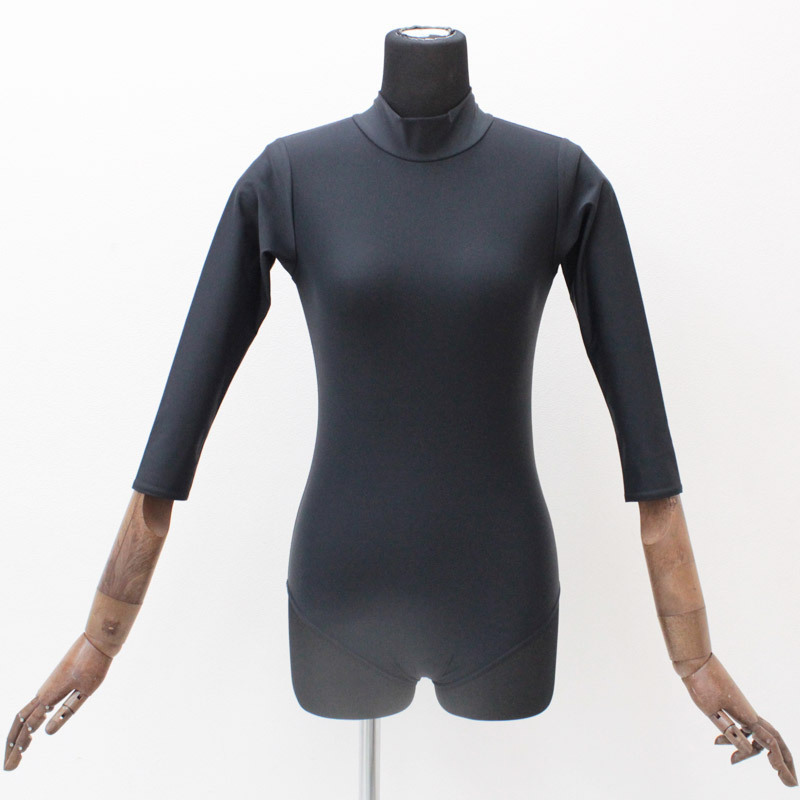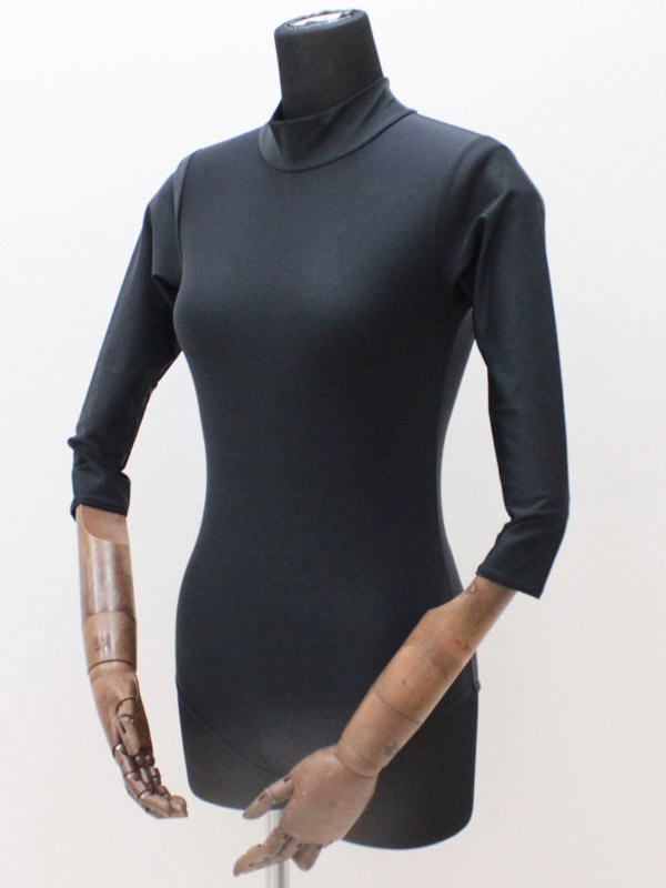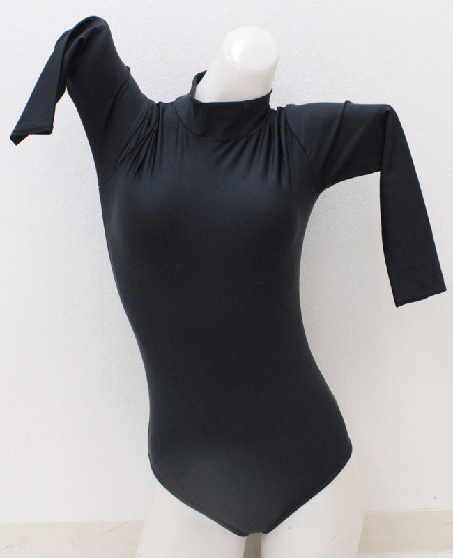 ![]() 柔らかで伸縮性のある生地を使用した、ブラックカラーのシンプルな七部袖丈ハイネックレオタード(単品)。