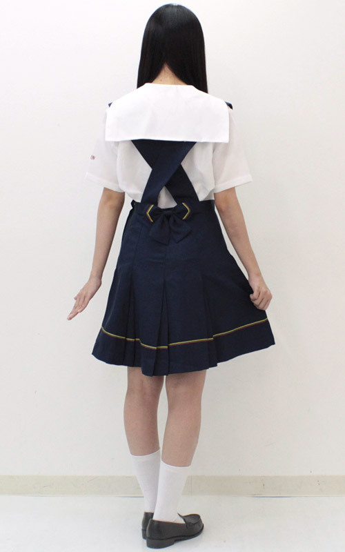 ブラウスの袖にロゴ、ライン入りジャンパースカートの後ろには、大きなリボンも付いています。 どこから見ても抜かりないオシャレな制服コスチュームです。 ※水洗い不可、塩素系漂白剤による漂白不可、アイロンは中温で当て布使用、ドライクリーニング可、色落ちの可能性があります、ご注意ください。 ※こちらの商品は在庫の状況によりお届けまでに4日〜7日程度かかる場合がございます。 ![]() --![]() NH3051M![]() Mサイズ:B〜100cm・W〜77cm ブラウス:着丈:61cm・袖丈23cm・肩幅39cm・首周り51cm ジャンパースカート:着丈50cm・肩紐83cm セット内容:ブラウス(前開きボタン)、ジャンパースカート(サイドファスナー・3段ホック式)、リボン(スナップボタン留めで取り外し可) 素材:ポリエステル100% ![]() [ BACK ]