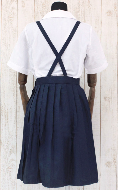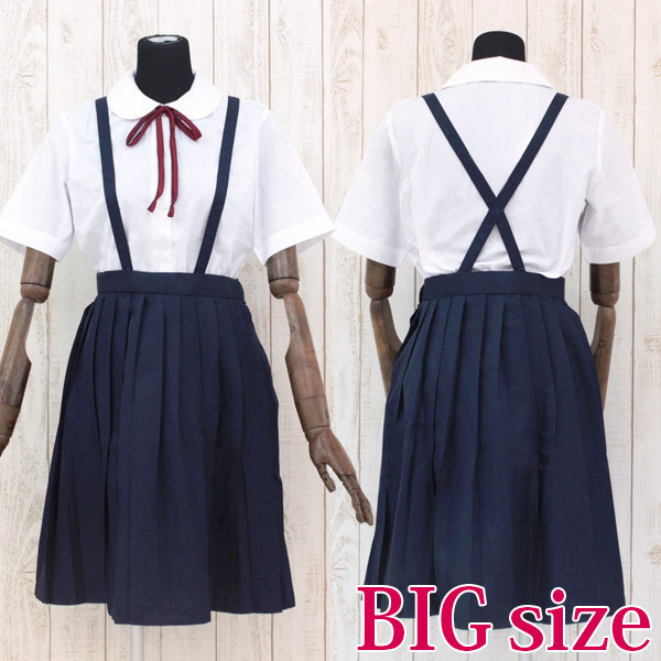 膝丈のプリーツスカートは、ウエスト部分で肩紐をボタン留めするタイプ。 エンジ色の細いリボンは丸襟ブラウスとの相性バツグン!レトロで可愛い制服衣装です。 ※水洗い不可、塩素系漂白剤による漂白不可、アイロンは中温で当て布使用、ドライクリーニング可、色落ちの可能性があります、ご注意ください。 ※こちらの商品は在庫の状況によりお届けまでに4日〜7日程度かかる場合がございます。 ![]() --![]() AO3028B![]() BIGサイズ:B85〜112cm・W76〜91cm 上衣:着丈69cm・袖丈27cm・肩幅45cm スカート:着丈61cm・吊り紐88cm(1本) セット内容:上衣シャツ、吊りスカート(三段ホック)、紐タイ 素材:上衣シャツ(ポリエステル65%綿35%)、スカート(ポリエステル100%) ![]() [ BACK ]