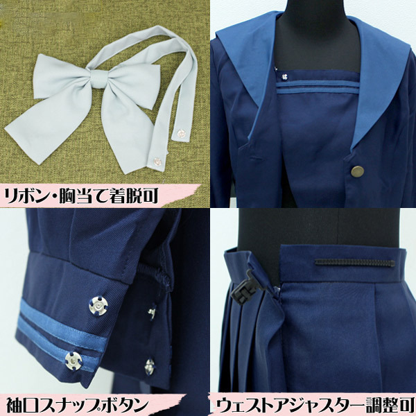 紺無地のセーラーブラウスとプリーツスカートに、ブルーグリーンのリボンがポイントの制服コスプレ。 胸当てとリボンはスナップボタンで着脱可能です。 ※水洗い不可、塩素系漂白剤による漂白不可、アイロンは中温で当て布使用、ドライクリーニング可、色落ちの可能性があります。 ![]() --![]() NH3077B![]() BIGサイズ:B〜110cm・W〜88cm 上衣:着丈58cm・肩幅45cm・袖丈68cm・袖口25cm スカート丈約42cm セット内容:上衣(前開きボタン留め、袖口スナップボタン留め、胸当てとリボンはスナップボタンで着脱可)、スカート(ウェスト部分アジャスター調整可)、リボン 素材:ポリエステル100% ![]() [ BACK ]