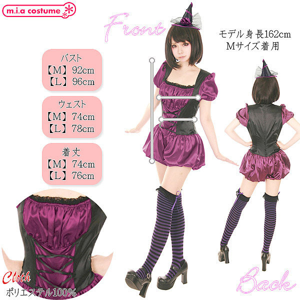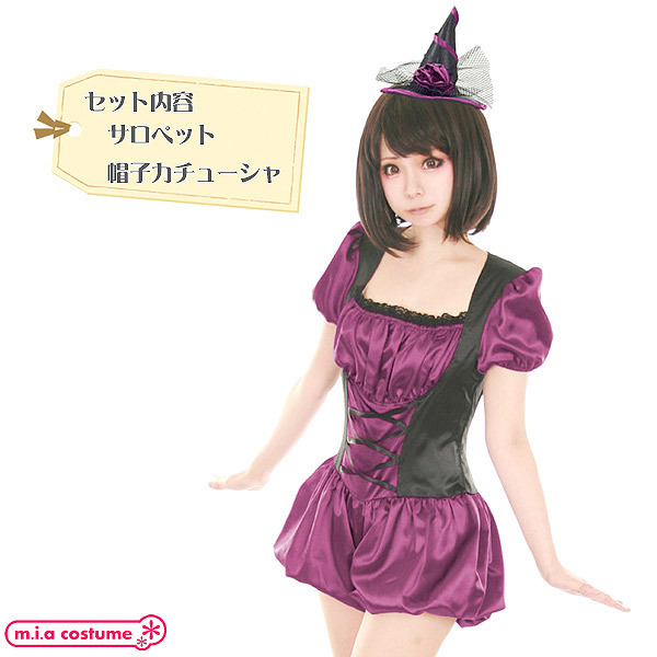 ![]() 小さな三角帽子がチャーミング♪サテン風の艶やかな生地を使用した、黒×パープルのダークポップな可愛い魔女コスプレ。