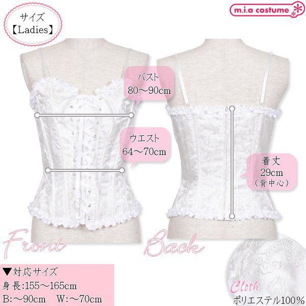 見た目をシュッと綺麗にスタイルアップ!女性らしいくびれを作り、フリルや花柄模様で華やかな印象を与えます。 フロントの編み上げを調整することでサイズ調整も可能◎Fサイズ ※洗濯不可、塩素系漂白剤による漂白不可、アイロン不可、ドライクリーニング不可 ※こちらの商品は在庫の状況によりお届けまでに4日〜7日程度かかる場合がございます。 ![]() ホワイト![]() CL053012![]() フリーサイズ:B80〜90cm・W64〜70cm・着丈29cm セット内容:コルセット単品(裏地なし、背面ファスナー) 素材:ポリエステル100% 対応サイズ:身長155〜165cm・B〜90cm・W〜70cm ![]() [ BACK ]