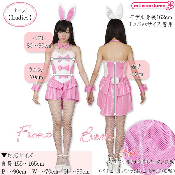 大きめのリボンを3つフロントに飾ったワンピースに、ペチコートパンツや付襟、ウサ耳カチューシャなど小物含めて6点がセットになったお得なバニーガール衣装♪後ろの丸い尻尾とウサ耳を外せばアイドル衣装としても使用できます。 Fサイズ ※しっぽ等白い部分に衣装の色移りがある場合がございます ※洗濯不可、塩素系漂白剤による漂白不可、アイロン不可、ドライクリーニング不可 ※こちらの商品は在庫の状況によりお届けまでに4日〜7日程度かかる場合がございます。 ![]() ピンク![]() CL875765![]() フリーサイズ:B80〜90cm・W70cm・着丈60cm セット内容:カチューシャ、付け襟、ワンピース(前ファスナー)、ペチコートパンツ、カフス、しっぽブローチ 素材:ワンピース(ポリエステル90%、ポリウレタン10%)、ペチコートパンツ(ポリエステル100%) 対応サイズ:身長155〜165cm・B〜90cm・W〜70cm・H〜96cm ![]() [ BACK ]