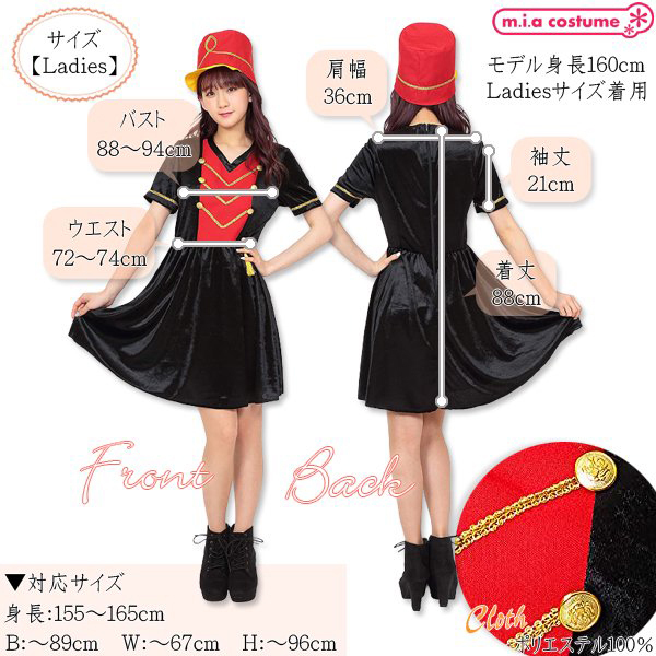 黒ベースのV字ネックワンピに赤を加え、金の装飾を施したクラシックなデザイン!大きく高さのある帽子を被れば貴女も立派なマーチングガールに変身♪背面ファスナー式で裏地はありません◎Fサイズ ※洗濯不可、塩素系漂白剤による漂白不可、アイロンは中温で当て布使用、ドライクリーニング不可 ※こちらの商品は在庫の状況によりお届けまでに4日〜7日程度かかる場合がございます。 ![]() --![]() CL881179![]() フリーサイズ:B88〜94cm・W72〜74cm・肩幅36cm・袖丈21cm・着丈88cm セット内容:帽子、ワンピース(裏地なし、背面ファスナー) 素材:ポリエステル100% 対応サイズ:身長155〜165cm・B〜89cm・W〜67cm・H〜96cm ![]() [ BACK ]
