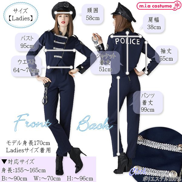 手錠もセットで付いてきます。 ※塩素系漂白剤による漂白不可、アイロンは中温で当て布使用、ドライクリーニング不可 ![]() --![]() CL867364![]() 対応サイズ:身長155〜165cm・B〜90cm・W〜70cm 実寸:B95cm・W64〜70cm・肩幅38cm・袖丈55cm・着丈(ジャケット51cm・パンツ99cm)・頭囲58cm セット内容:帽子、ジャケット、パンツ、手錠 素材:ポリエステル100% モデル身長170cm ![]() [ BACK ]