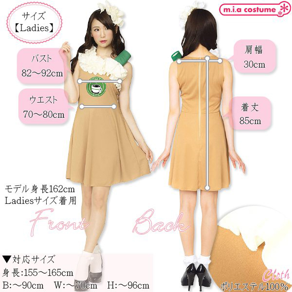 ハロウィンやクリスマス仮装、変装用のステージ衣装や舞台衣装として注目されること間違いなし!コーヒーカラーのワンピースはストレッチ素材で着やすく付属のシールを胸元に付ければキュートなカフェスタッフに!ふわっと裾の広がったスカートで女性らしい印象を出しちゃおう♪ ※洗濯機不可、塩素系漂白剤による漂白不可、アイロンは中温で当て布使用、ドライクリーニング不可、摩擦や水濡れにより色移りする恐れがあります。 ![]() --![]() CL890744![]() 対応サイズ:身長155〜165cm・B〜90cm・W〜70cm・H〜96cm 実寸:B82〜92cm・W70〜80cm・肩幅30cm・着丈85cm セット内容:カチューシャ、ワンピース(背中心ファスナー)、シール 素材:ポリエステル100% モデル身長162cm ![]() [ BACK ]
