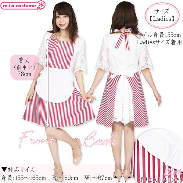 ウエストの白いフリルエプロンは一体型になっていて、首と腰でリボン結びするタイプだから体型にあわせてサイズの調整が可能です♪キッチンだけでなく、お料理教室やプレゼントとして、ホームパーティーなどにも!アメリカンダイナーやウェイトレス風にもコーディネート出来るので、学園祭、カフェイベントでの使用にもおすすめです! ※洗濯機不可、弱い手洗い可、塩素系漂白剤による漂白不可、アイロンは中温で当て布使用、ドライクリーニング不可 ![]() レッド![]() CL883579![]() 対応サイズ:身長155〜165cm・B〜89cm・W〜67cm 実寸:着丈78cm(前中心) セット内容:エプロン単品(首リボン、腰リボン) 素材:ポリエステル100% ![]() [ BACK ]