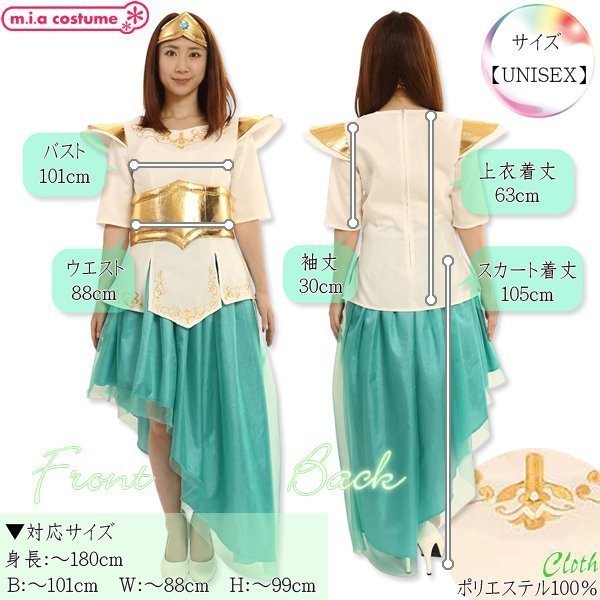金ぴか素材とスカートのチュールがキラキラとしてカッコいい♪セット内容は上衣、スカート、ヘアバンドの3点セットで充実!届いたらすぐに変身できちゃうのも嬉しいポイント♪他のカラーと合わせてみんなで着よう! ※洗濯不可、塩素系漂白剤による漂白不可、アイロンは中温で当て布使用、ドライクリーニング不可 ※こちらの商品は在庫の状況によりお届けまでに4日〜7日程度かかる場合がございます。 ![]() グリーン![]() CL854166![]() 男女兼用サイズ:身長〜180cm・B〜101cm・W〜88cm・H〜99cm・着丈(上衣63cm・スカート105cm)・袖丈30cm) セット内容:上衣(背中心ファスナー)、スカート(ウエストゴム)、ヘアバンド 素材:ポリエステル100% ![]() [ BACK ]
