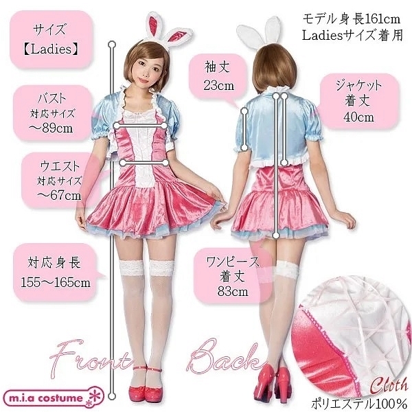 フロント部分はレースアップになっているので、若干のサイズ調整も可能です。 紐を違う色に変えたり、ポップなカラーの小物やウィッグでコーディネートしても楽しいですね! ※水洗い不可、塩素系漂白剤による漂白不可、アイロン不可、ドライクリーニング不可、色落ちの可能性がありますのでご注意ください。 ![]() --![]() CL847328![]() Ladiesサイズ(モデル身長161cm):B〜89cm・W〜67cm・身長155〜165cm・袖丈23cm・ワンピース着丈83cm・ジャケット着丈40cm セット内容:カチューシャ、ジャケット、ワンピース(背中心ファスナー) 素材:ポリエステル100% ![]() [ BACK ]