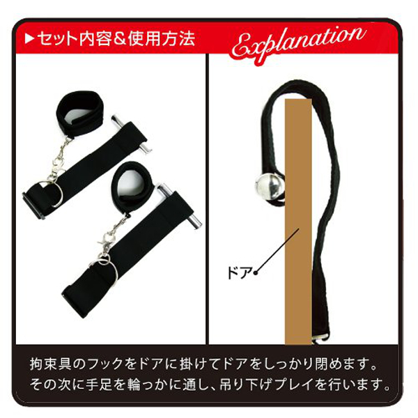 跡を残りにくくするため、手首に直接触れるバンド部分にソフトなウレタン素材を採用!バンドはマジックテープ仕様なので、サイズ調節や一人での着脱もラックラク!また、ドアに吊り下げる引っ掛け部分のベルトも長さ調節可能です。 いつもと違った拘束プレイでパートナーとのマンネリ解消!?ソフトからハードまでのSMプレイを満喫できる拘束グッズです。 ※設置場所の状態を確認してからご使用ください。 ![]() --![]() ドア腕拘束![]() パッケージ:13.5×19.0×7.0cm![]() [ BACK ]