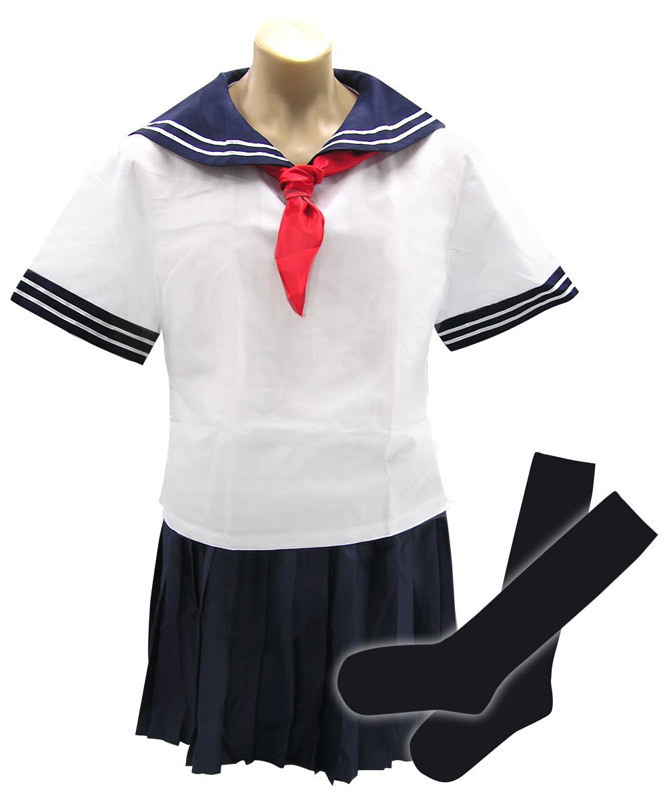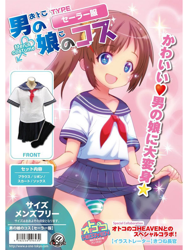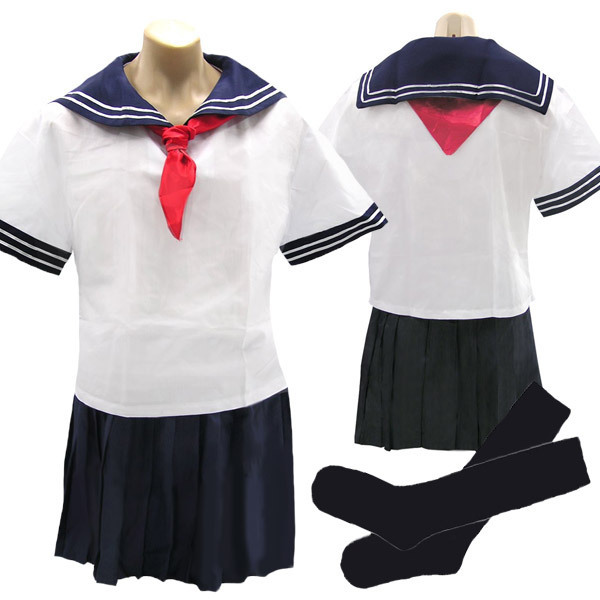 大きなサイズが無くて、仕方なく諦めていた夢を叶えちゃおう!ブラウス・リボン・スカートに紺の靴下まで一式揃った、男性用セーラー服コスチュームです。 ![]() --![]() --