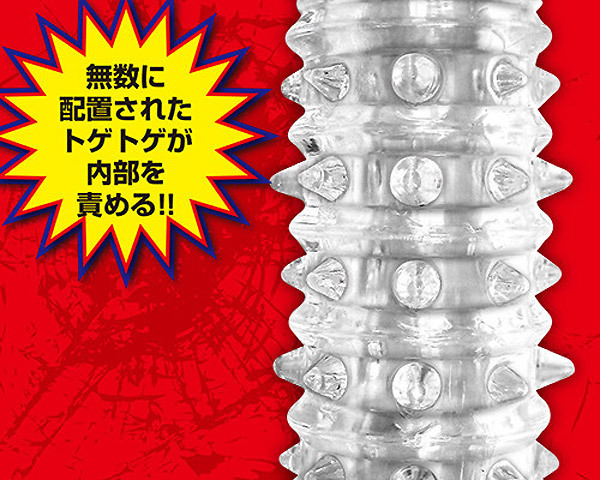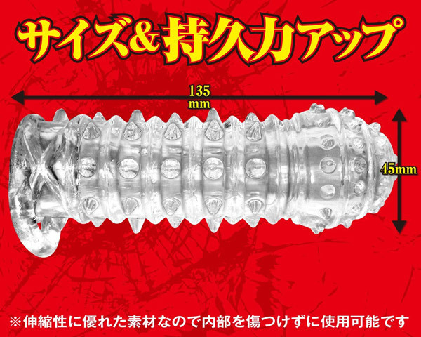 ●先端まで全て覆うオールカバー。 ●肌が透けて見えるクリアタイプ。 ●玉掛けリング付きで安定感抜群。 ●最大径45mmのビッグサイズ仕様。 ●高い伸縮性素材で装着ラクラク。 ●たっぷりトゲ突起が全体を覆う。 ●優しくソフトな弾力の絶妙刺激。 ●手軽にサイズ&持続力UP。 みっちり敷き詰められた三角突起で内部をジョリジョリと攻撃しまくる高刺激系。 見た目のわりにソフトな感触で傷つけることなく、尚且つベストすぎる刺激で快感を与えます。 ![]() --![]() 極悪![]() パッケージ:17.0×7.5×7.5cm 本体:13.5×4.5cm![]() [ BACK ]