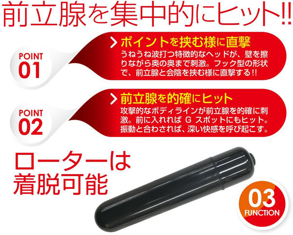 ●ややS字のようなフック型形状●複雑なうねり満載の凹凸ボディ●腸壁を刺激しながら奥まで進む●前立腺と会陰を挟むような構造●ヴァギナ使用でGスポ責めにも●ローター部分は取り外し可能●底部ボタンで3段階に調節OK。 ひと目見ただけでわかる刺激度満点なデコボコラインが魅力のエネマグラ。 アナルはもちろんのこと、ヴァギナに使えば敏感部分に絶妙ヒット!計算されたフック型ボディがポイントです。 ※電池周りの保護用シートは外さないでください。 ![]() --![]() ティップ![]() パッケージ:18.5×13.0×4.0cm 本体:最大幅約2.5cm 電池:単四電池×1本使用![]() [ BACK ]