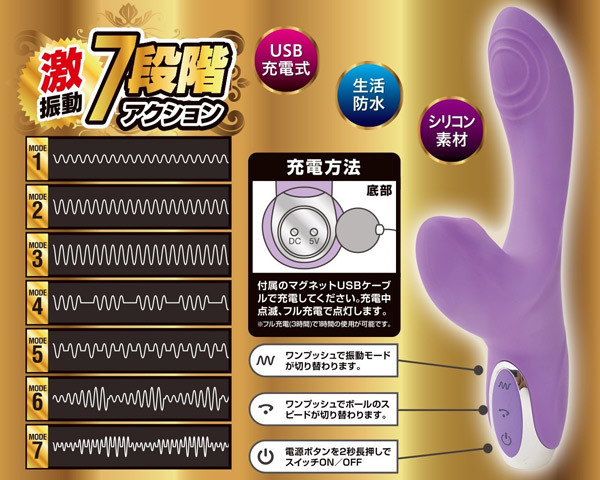 3段階スピード調整が可能なクリバイブにムービングボールを内蔵し、まるでクリトリスを指先でいじられているような快感に。 本体部分は7段階ファンクションの激振動がGスポットを狙い撃ちするフィット形状!さらに膣全体にその振動が行き渡ります。 付属のマグネットUSBケーブルでワンタッチ充電ができるUSB充電式!約3時間のフル充電で約1時間の使用が可能です(使用状況、環境により時間が変化する場合がございます)。 ![]() --![]() --