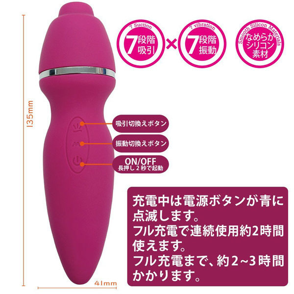 乳首にぴたっ!クリにぴたっ!吸い逃さない設計でしっかり捉えるなめらかシリコン素材のアタッチメントが付属。 多彩なバリエーションを楽しめる7段階吸引×7段階振動を搭載!USBでの充電約2〜3時間で約2時間使用可能(使用状況、環境により時間が変化する場合がございます)。 ![]() --![]() --