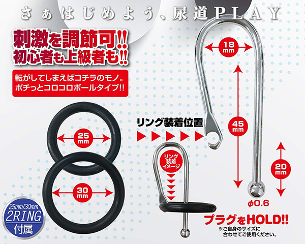ショートサイズだから使い勝手が良く、先端部分のボールが尿道を刺激するタイプでリングの大きさは25mmと30mmの2サイズ♪メタル素材だから煮沸消毒ができるほか、耐久性も期待できるので、自分の好みのところへセットできたら、付属のリングでそのまま固定出来るように設計されています。 先端部分のボールは直径6mmのため、そこまで拡張はできませんが、ずっと装着していたくなる不思議な感覚が味わえます♪初心者から上級者までお楽しみ頂ける本作品。 とはいえ、尿道プレイは危険を伴う場合もありますので、使用の際は無理のない範囲でご使用ください! ![]() --![]() ボール![]() パッケージ:14.5×9.2×2.0cm 本体:プラグ最大径0.6cm・リング小内径2.5cm・リング内径大3.0cm![]() [ BACK ]