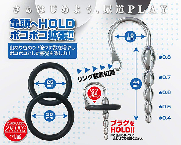 ショートサイズだから使い勝手が良く、先端部分のボールは4mm径から始まり、1mmずつボコボコが太くなりながら、最終的には8mmにまで達するという5段階の刺激が楽しめるタイプとなっています!リングのサイズは25mmと30mmの2サイズでご自身のサイズに合わせられるほか、メタル素材だから煮沸消毒ができたり耐性があったりと、しっかりとした使い心地が味わえます♪自分の好みのところへセットできたら、付属のリングでそのまま固定できるように設計されていますが、尿道プレイは危険を伴う場合もありますので、使用の際は、商品特性をご理解のうえ自己責任でお楽しみください。 ![]() --![]() ボム![]() パッケージ:14.5×9.2×2.0cm 本体:プラグ最大径0.8cm・リング小内径2.5cm・リング内径大3.0cm![]() [ BACK ]