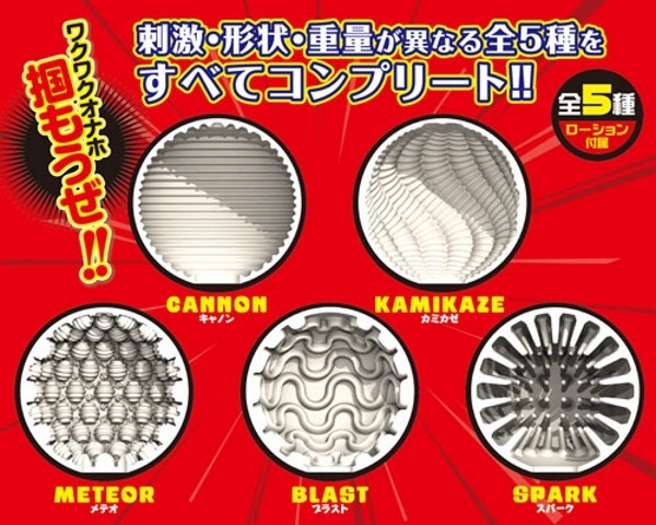 刺激・形状・重量の異なる全5種類で登場!!【キャノン】スタンダードなねじ切りタイプ。 細かいヒダヒダが竿を刺激【カミカゼ】いくつもの細かな凹凸をトルネード上に配置【メテオ】無数のイボ突起が、流星の如く襲い掛かる【ブラスト】ウェーブ状に配置された突起が、カリ首を咥え込む。 【スパーク】ヒゲ状の突起がくすぐりながら弾けて刺激。 ディスプレイ用としても使用可能なBOXに5種×5個の計25個入った状態で発送いたします。 ガチャマシーンに入れて販売することも可能ですが、カプセルにはバーコード付きフィルムが巻かれているので店頭での販売も可能です。 ![]() --![]() 5種×5個![]() パッケージ:21.0×19.5×29.5cm カプセル直径:7cm 全5種![]() [ BACK ]