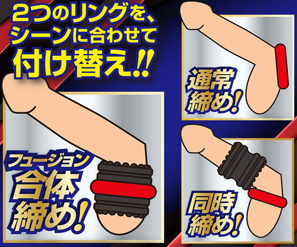 ![]() シリコン×エラストマーが合体(フュージョン)!締め付け感が超アップ!2種類のリングをシーンに合わせて自由に付け替え!それぞれ単体でも効果抜群!合体させれば潜在能力をフルで発揮!玉や竿を強力に締め付け、勃起力・射精力・持久力をUP!!攻守ともにスキのないパワー漲るZ級のアイテムをお届けします。