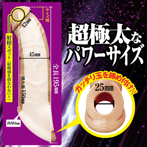 サイズ感・持久力・射精感もアップ!伸縮性もあるエラストマー素材でありながら、タマをガッチリ締め付ける装着感の良さ。 フリーサイズなのでどんな方も装着できます!サック機能も一体化し、男性機能をサポート。 射精スポットを配置したことで、快感度もさらにアップ。 いつものプレイもグッと盛り上がる、漲る男性力をあなたに!Gスポット・ポルチオも十分に刺激でき理想的な亀頭のフォルムと女性が満足する太さを実現。 ![]() --![]() LLサイズ![]() パッケージ:22.5×7.0×7.0cm 本体:全長19.5cm・挿入部15.0×最大径4.5cm・カリ径4.2cm・タマ装着穴2.5cm![]() [ BACK ]