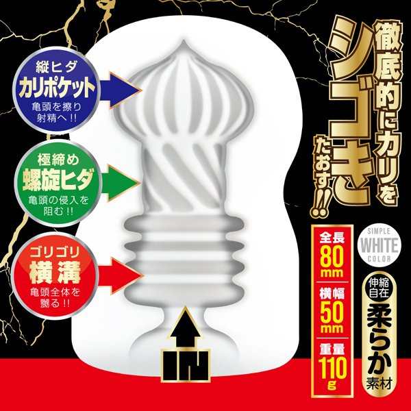 亀頭への刺激を重点的に考え開発されたカリベーション!オナニーに集中がしやすいホワイトカラーのボディと、一切の無駄を省いたシンプルな造形が特徴。 挿入し、擦ったり引っ張ったり摘まんだり、あなた好みに刺激すればカリコキ爆快感が得られます!挿入口はスリ鉢状になっているので、全体にローションを塗り広げられるからとっても便利。 本体はソフト素材なので伸縮自在。 亀頭を集中的に刺激し、感じた事のない快感をつかめ! ![]() --![]() --