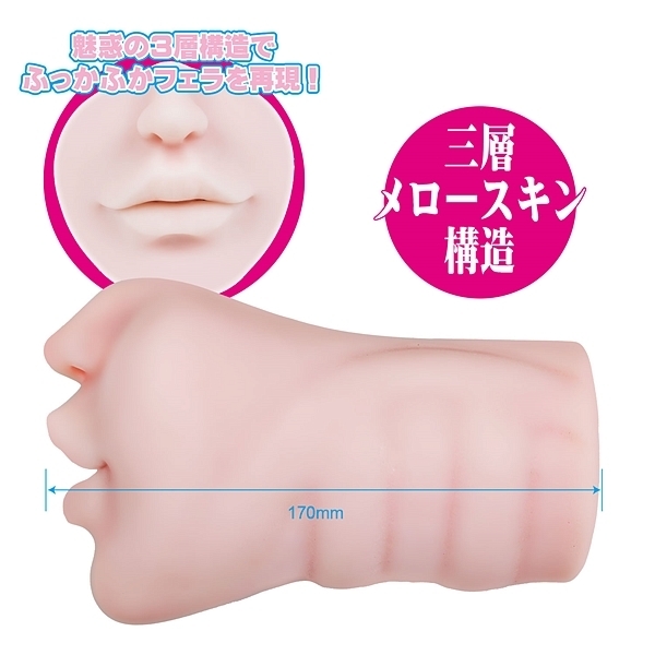 より柔らかさと弾力性を追求したメロースキンを使用し、なんと三層構造に成功しました。 三層にすることで、よりもっちりした口腔内部構造、ほどよい弾力とボリュームをもたせた本体内部構造、肌のハリを感じられる外部構造となっています。 口腔内部は唾液(ローション)がより絡む設計になっており、ホール内部のピンはのど輪が極まりやすいイラマ構造を採用しています。 リアルな歯(ソフト)と舌(ねっとり)を感じ取れるまさに口技の一閃がここに。 600gオーバーのボリュームとともにお楽しみください。 ![]() --![]() --