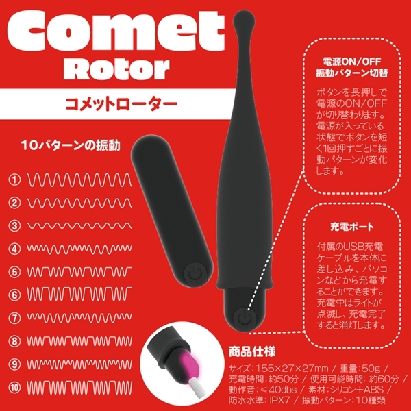 ![]() 初心者でも扱いやすいピンポイントローターです♪ヘッド部分には肌触りの良いシリコン素材を使用し、小型ながらもパワフルな刺激をお届けします!狙ったポイントを的確に刺激できるピンポイントモードと、シリコンヘッドを外して使用するノーマルモードの2WAY仕様♪ワンボタンで簡単に操作でき、10種類の振動パターンからお好みの刺激を選べます!IPX7等級の完全防水なので、お風呂などでも使用可能です♪