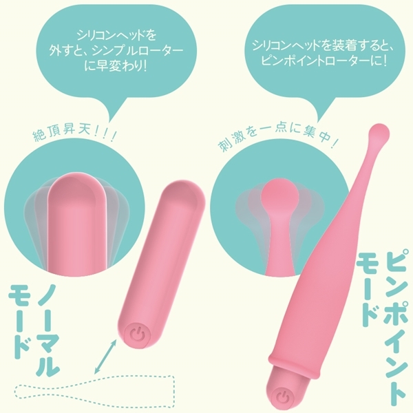 ![]() 使いやすさとパワフルさを兼ね備えたピンポイントローターです♪小さめのボディでありながらも、ヘッド部分にシリコン素材を採用し、肌に優しい心地良い刺激を届けます!ピンポイントモードで集中的に狙う使い方と、ヘッドを外して広範囲に使えるノーマルモードの2WAY仕様なので、気分に合わせた使い方が可能♪ワンボタンで10種類の振動パターンを選べる操作も簡単です!IPX7の完全防水設計なので、お風呂でも安心して使用できますよ♪
