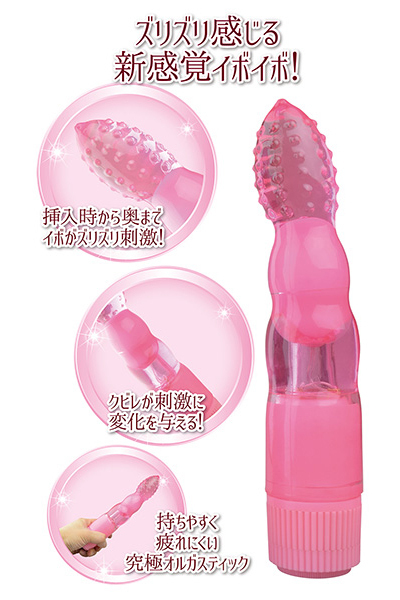 先端がイボイボしたデザインで、抜き差しする度に内壁をズリズリと擦り上げる!途中のクビレは刺激に変化を与え、何度抜き差ししても飽きのこない気持ちよさを味わえます♪また、内部にはハイパワーローターを搭載!振動による刺激を感じることも。 底部にある無段階調整ダイヤルをクルリと回せば、お好きな強さでお楽しみいただけます♪ぷるんとした柔らか素材だから、硬いものが苦手という方にオススメです。 ![]() --![]() バンプ![]() パッケージ:22.6×9.0×6.6cm 本体:18.5×4.0cm 重量:135g 電池:単三電池×2本使用![]() [ BACK ]