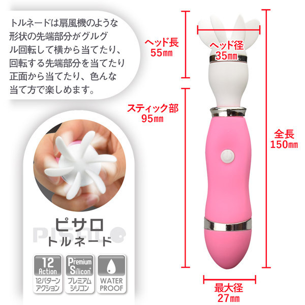 先端の羽がクルクルとトルネード回転!敏感な部分を横&正面から叩いて刺激する♪本体には柔らかなプレミアムシリコン素材で触り心地よく振動を軽減!長時間のプレイでも疲れにくい設計となっています。 生活防水仕様、単4電池×2本使用 ![]() --![]() トルネード![]() パッケージ:17.5×9.0×4.5cm 本体:14.8×2.7cm 重量:40g 電池:単四電池×2本使用![]() [ BACK ]