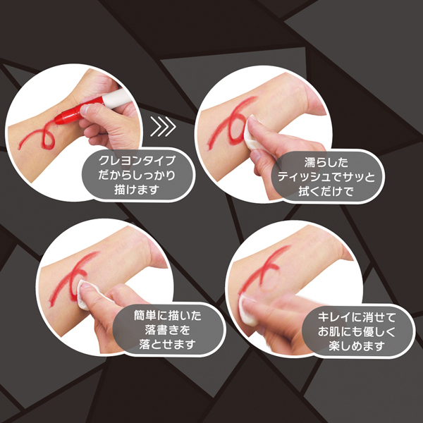 肉便器、性奴隷、発情中などなど好きな凌辱ワードを身体に書いてプレイを盛り上げよう!パートナーとはもちろん、一人で使っても興奮高まる♪素材は肌に優しい水性素材仕様で、濡れた布で拭き取るだけで簡単綺麗さっぱり!ハロウィン仮装のペイントにも◎ ![]() --![]() --