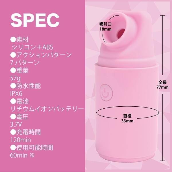 上質なモーター搭載の吸引機構に高品質シリコン素材の吸引口と持ちやすいサイズ、さらにはIPX6の高レベル防水性能だからしっかり洗えて衛生的です。 使用時は蓋を外して底面に付けられます。 どこでもキャリー出来る自分だけのプレジャーアイテムです。 3.7Vリチウムイオンバッテリー搭載で120分で満充電、最大60分の連続使用が可能です(使用環境により大幅に増減します)。 多彩で実用的な7パターンの吸引を演出します。 見た目と実用性を兼ね備えたMY PLEASURE GOODSです。 ●カラー:パープル ![]() パープル![]() --