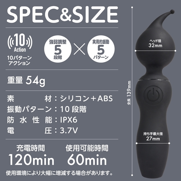 ![]() コンパクトで使いやすいピンポイント刺激が可能なデンマです♪先端はピンポイント刺激に特化した形状を採用し、心地よい肌触りと柔らかさにこだわったオールシリコンボディが特徴!5段階の強弱調整と5パターンのアクションを組み合わせた10パターン振動が楽しめます♪軽量で疲れにくいので、長時間の使用も快適!IPX6の高レベル防水性能を備えており、しっかり洗えて衛生的に使える便利なアイテムです♪