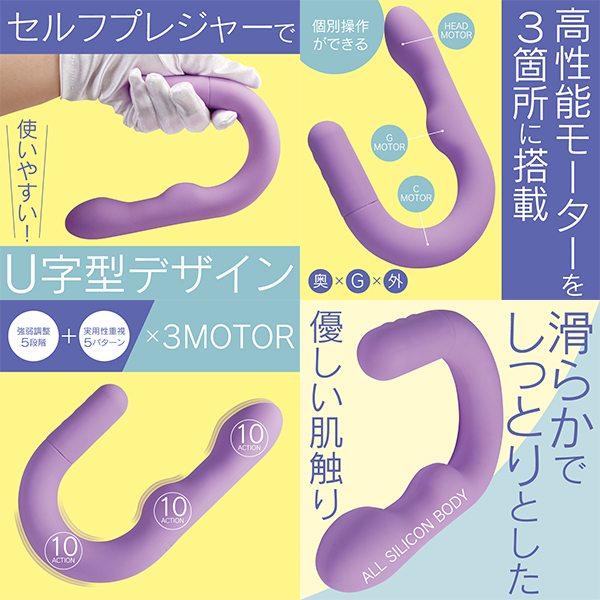 ![]() セルフケアに特化したU字型バイブレーターです♪ヘッド・Gポイント・外側刺激用、それぞれに独立したモーターを搭載!好みに合わせて個別に振動を調整できるのが特長です♪振動は5段階の強弱設定と、5種類の多彩なパターンを組み合わせた計10種類を搭載!押し当てて楽しむ独自の形状が、より自由な使い方をサポートします♪高性能モーターと高品質素材を組み合わせた、信頼のジャパンクオリティ設計!オールシリコンボディは、しっとりとやさしい触り心地で、快適な使用感を提供します♪約120分の充電で、最大約60分の連続使用が可能!(使用環境により変動します!)IPX6相当の防水仕様で、使用後はしっかり洗えて、清潔に保つことができます♪