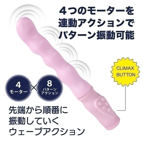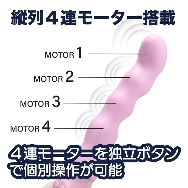 ![]() 4つのモーターを搭載した高機能プレジャーアイテムです♪先端から根元まで配置されたモーターは、それぞれ個別に操作可能♪振動は3段階の強弱と5種類のパターンから選べます!先端をハイパワー振動にして、根元をリズミカルなパターン振動に設定するなど、組み合わせは自由自在♪さらに、特別なCLIMAXボタンを押すと、全モーターが一斉に振動したり、根元から順番に波打つような動きを楽しめます!本体表面には、リアルなやわらかさと滑らかな手触りを再現した特殊TPE素材を使用♪手に取るたびに、やさしいフィット感を感じられます!充電は約60分で完了し、最大90分間の連続使用が可能です♪